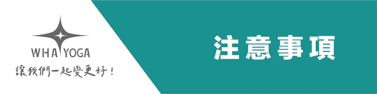 若有舊傷或不適,請務必於課前告知老師。若有任何傳染性疾病或慢性疾病等(不限於身體有傷口、發炎、感染、肌肉扭傷、高血壓、心臟病、中風、癲癇症...等),有影響學員健康、安全之情事或是其他特殊狀況者,建議尋找專業醫師諮詢,確定體能狀況適合參加瑜珈課程。
